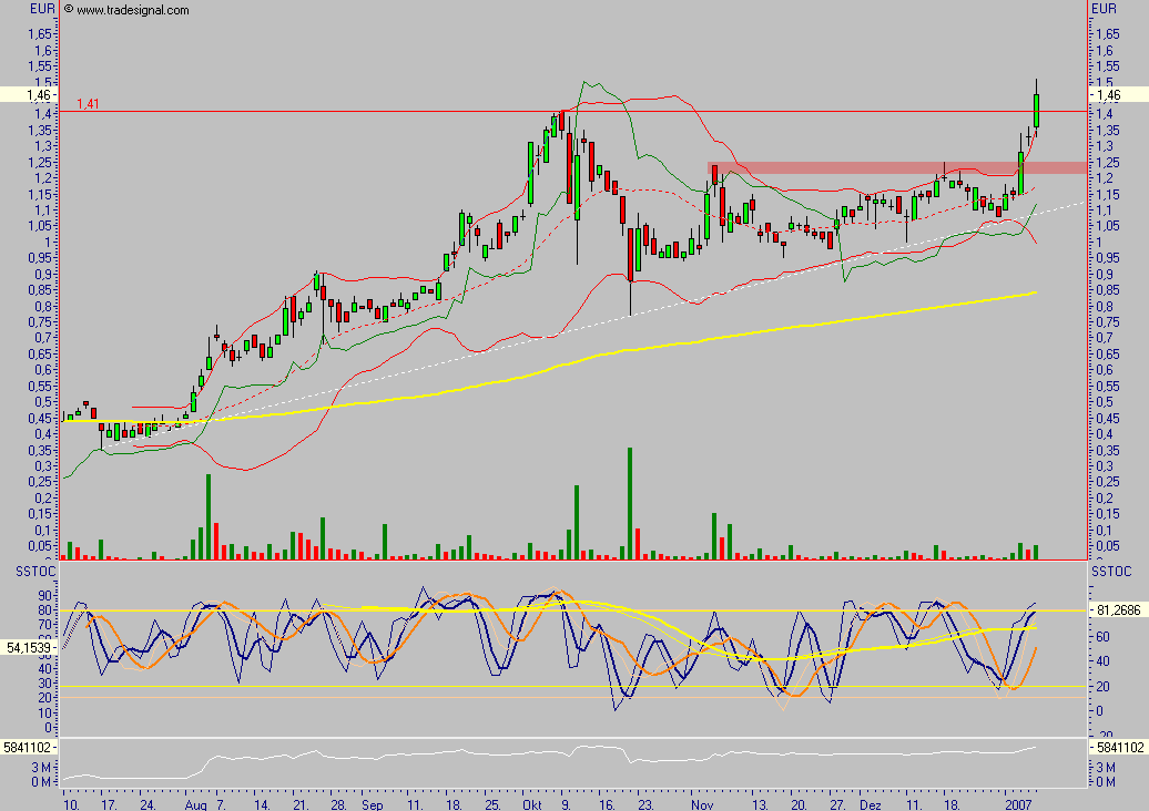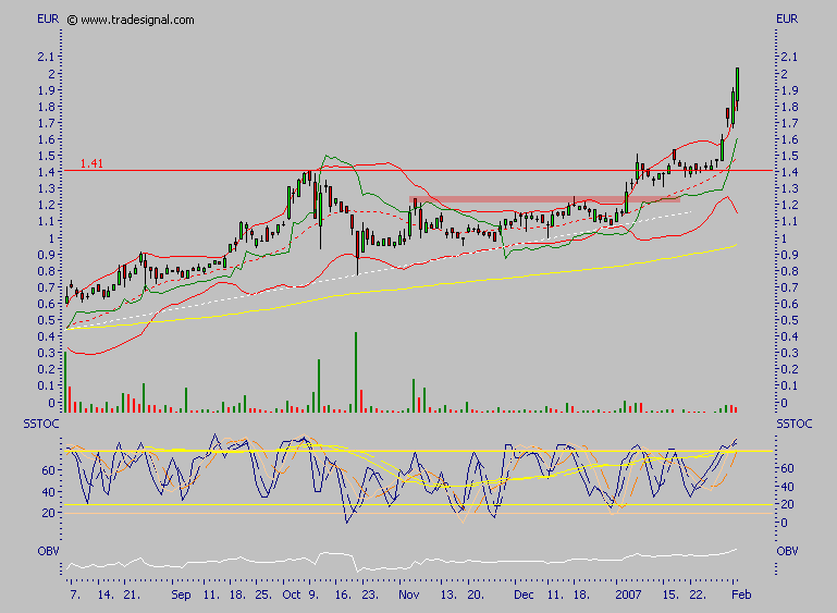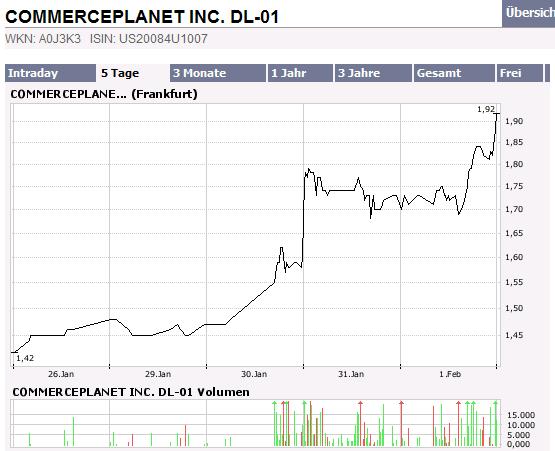 Die Experten des Hot Stocks Investor empfehlen bei Commerceplanet keine Zeit zu verlieren, da sich die Kursrallye spätestens bei der Vorlage der Gesamtjahreszahlen weiter beschleunigen werde, obwohl sich die Titel in den vergangenen zehn Monaten schon im Wert verzehnfacht hätten. Die Wettbewerber würden im Schnitt mit einer Gewinnvielfachen von 26 bezahlt, während Commerceplanet ein 2006er KGV von 11 aufweisen würde. Der Anbieter von medialen Dienstleistungen und Marketingwerkzeugen meldete für das dritte Quartal 2006 einen Umsatz von 9,7 Millionen US-Dollar. Ein Jahr zuvor betrugen die Erlöse 1,8 Millionen Dollar. Das Nettoergebnis verbesserte sich von minus 2,2 Millionen auf plus 3,1 Millionen Dollar beziehungsweise sieben Cent je Aktie. Selbst im Vergleich zum Vor-Quartal hat sich der Gewinn damit verdoppelt. Auch wenn es im vierten Quartal 2006 keine weitere Steigerung gegeben hätte, würde Commerceplanet im Gesamtjahr rund 28 Millionen Dollar erlöst und 18 Cent je Anteilschein verdient haben. Allerdings spreche einiges dafür, dass Commerceplanet auch im vierten Quartal mit Rekordergebnissen aufwarten könnte. Die Autoren schätzen den Gewinn je Aktie für 2006 vorsichtig auf 20 Cent und für 2007 auf 35 bis 40 Cent, was einem KGV von 5 entsprechen würde.