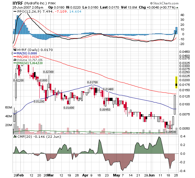 HYRF is currently up 34.62% on 14,639,430 shares traded. HYRF report from 6/25/07: