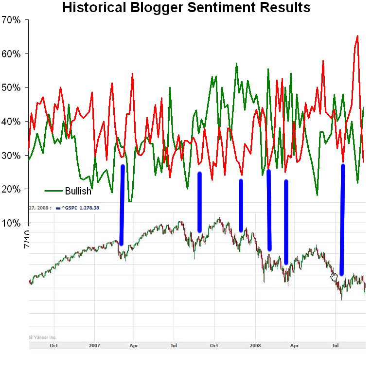 - Ab Sommer 2008 wurde er zum perfekten PROindikator! Die Blogger waren im Tief bullish und im Sommerhoch bearish. Dies ist insofern erklärbar, als die Blogger ja auch nicht doof sind und dazulernen. Ihre Prognosefähigkeit passt sich automatisch den Rahmenbedingungen einer Baisse an.