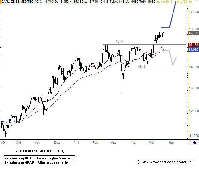 Die Aktie von Carl Zeiss Meditec sollte auch in den kommenden Wochen weiter nach oben tendieren, wobei mittelfristig durchaus Kursgewinne bis hin zu 19,10 Euro locken. Zwischenzeitliche Korrekturen sollten auf dem Weg dahin jedoch eingeplant werden. Im Idealfall aber fällt der Kurs auch im Rahmen einer solchen nun nicht mehr nachhaltig unter 14,89 Euro zurück. Ein solch tiefes eintauchen in die alte Konsolidierungsformation könnte weiteres Verkaufsinteresse wecken und Kursverluste bis auf 14,14 Euro ermöglichen.