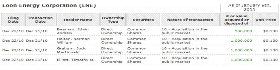 2) Da haben sich vier Leute aus dem Management von Loon Energy am 21.12. (man beachte den Zeitpunkt) insgesamt 3,5 Mio Aktien gezogen zu einem Wert von 455000 $! Ein Schelm, wer Böses dabei denkt ...