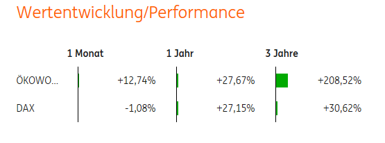 Performance ist aber trotzdem nicht ohne (nur bei 1 Monat schneidet Ökoworld im Vergleich mit dem DAX schlechter ab...)