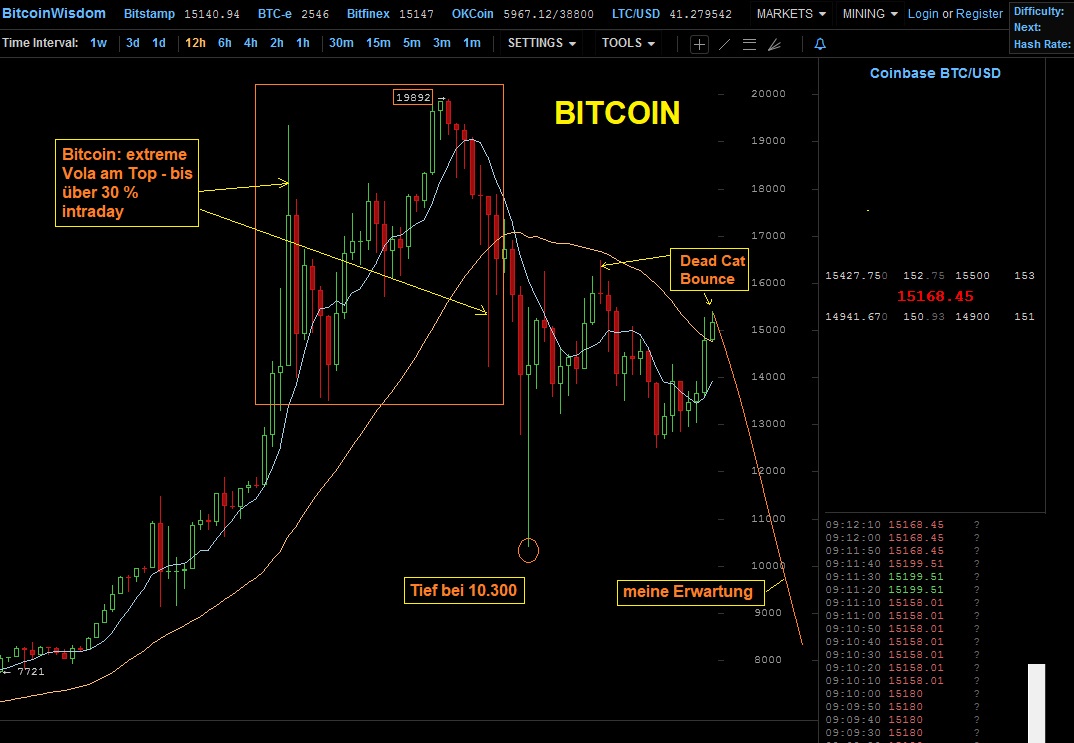 Seitdem gab es bei Bitcoin zwei "Dead Cat Bounces". Ich erwarte, dass der aktuelle bei spätestens 16.000 endet, gefolgt vom finalen Absacker auf weit unter 10.000. Ich erwarte weiterhin, dass die Börsen die Risikoscheu, die sich bei Bitcoin breit machen wird, teilen werden.