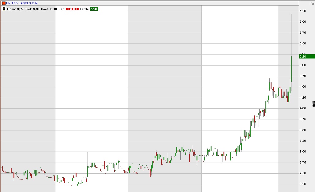 Kurszuwächsen bei United Labels. Die Aktie notierte im Hoch bei 6,18 Euro.