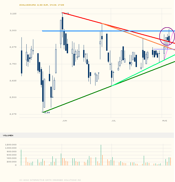 Lassen wir uns überraschen.. jedenfalls ist es in meinen Augen offensichtlich, das da jemand über den Kurs seit Wochen wacht und jegliche Ausbrüche sofort stoppt, bzw. kaufsignale.. Die Lows aus Mai, mit Alltimelow 2,391 sind Geschichte und werden auch die Lows bleiben.. Zeit wirds, mal wieder über 3Eu zu kommen.. Im Moment genießen wir ja seit Mai eben nen "kleinen" flachen Aufwärtstrend, aber wie lange hält der noch?? Und nun auch noch der drohende Rauswurf aus TecDax.. Obwohl - da seh ich evtl sogar QSC als Wackelkandidat.. Denn man schaut ja nicht nur nach der Mcap, sondern auch nach dem Börsenumsatz, und bei letzteren sind wir sogar deutlich besser wie QSC.. Es muß halt kurstechnisch so eine Art Ausbruch über 3Eu kommen, aber wann??