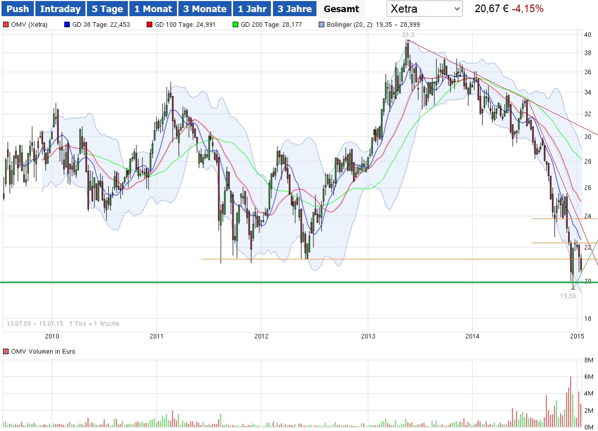 Für eine erste kleine Position für ein long Investment ist es sicherlich momentan nicht der ungünstigste Zeitpunkt. Dann würde ich schauen, ob er Kurs nochmals gen 20,- rauscht und dort nach legen, ansonsten eher warten bis OMV die 23,60 dauerhaft überschreitet. Dies würde bedeuten, dass der steile Abwärtstrend seit 07.2014 gebrochen wäre. Bei 23,60 wäre auch der übergeordnete flacher verlaufende Abwärtstrend seit 09.2013 gebrochen und die Aktie könnte tatsächlich zu einer Erholung in Richtung Buchwert ansetzen. Als zusätzliches Krieterium würde ich mir den Ölpreis beim überschreiten der 23,60 anschauen, dieser sollte auch in einem Aufwärtstrend sein. Das führt meiner Meinung zu einer Stabilisierung bei OMV. Zuletzt lohnt auch ein Blick auf den ATX, der macht schon recht häufig eine leichte Erholung, bevor die OMV nachzieht.