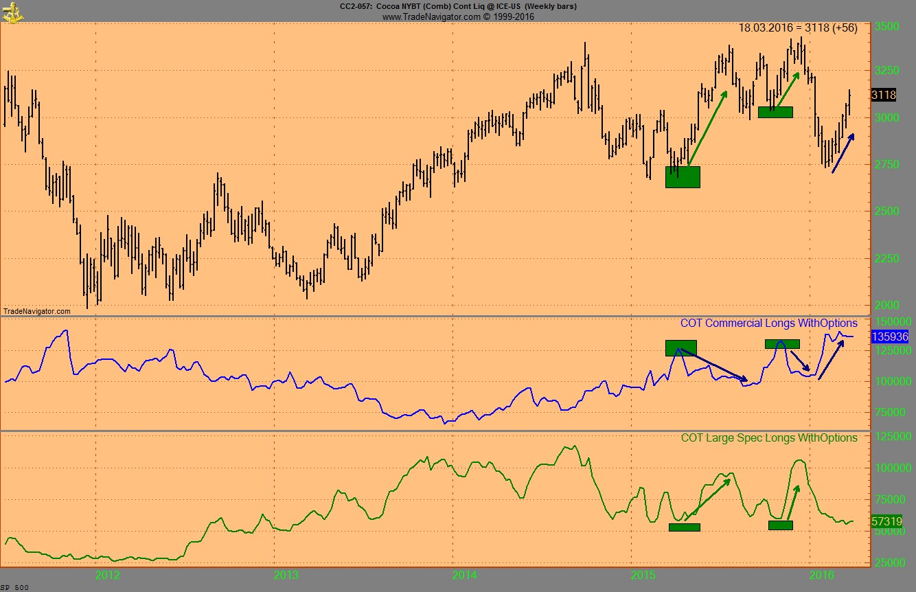 Preisanstiegen geht eine Longpositionierung der Comms voraus (lokale Maxima)