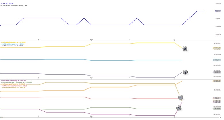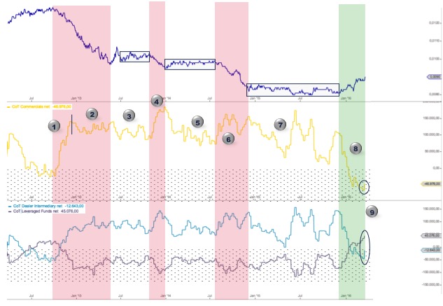 In Phase (8) geht der Yen wieder vielen Erwartungen hoch – die Dealer gehen short – also die Gegenposition für die Buy-Side ist „long“ – also das, was der Markt will, wird verkauft. Und das recht deutlich – tiefer Down-Peak.