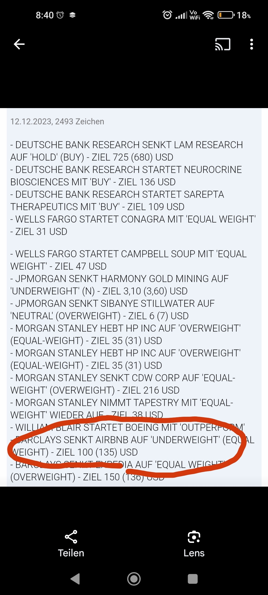 Der Börsenwert von Airbnb liegt derzeit bei 77,31 Mrd. USD. Der P/FCF liegt demnach bei 18,4. Die hohen Barmittelbestände sind darin noch nicht berücksichtigt. |