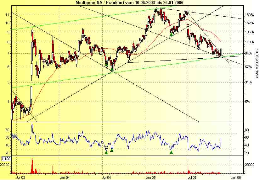 Interessantes tut sich nach wie vor im Chart von Medigene. Nach einer Leidensstrecke, die vom Markt übertrieben lang gezogen wurde nach den Studienergebnissen zu Polyphenon E, ist die Aktie derzeit möglicherweise in einer Bodenbildung begriffen. Die Trading-Range, die es zu beachten gilt, verläuft zwischen 6.90 und 7,40 Euro. Bricht die Aktie nach oben aus, sollten Trader Positionen spätestens aufbauen. Zunächst besteht in diesem Fall ein Aufwärtspotenzial von rund 10 Prozent, mittelfristig könnte es allerdings eine Trendwende nach oben werden, nachdem das Papier aus fundamentaler Sicht wieder ein interessantes Einstiegsniveau erreicht hat. Spannend werden in diesem Zusammenhang auch die Quartalszahlen der Biotech-Company, die eigentliche Phantasie kommt aber aus der Medikamenten-Pipeline.