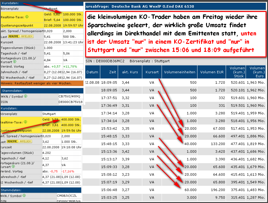 Im Anhang sind ein paar Umsätze, die am Freitag "nur" über Stuttgart und "nur" in einem KO-Zerti getätigt wurden von den "kleinvolumigen" KO-Tradern. Im übrigen handeln befreundete VV und Prop-Trader ebenfalls mit KO-Zertifikaten (handeln, nicht zocken)