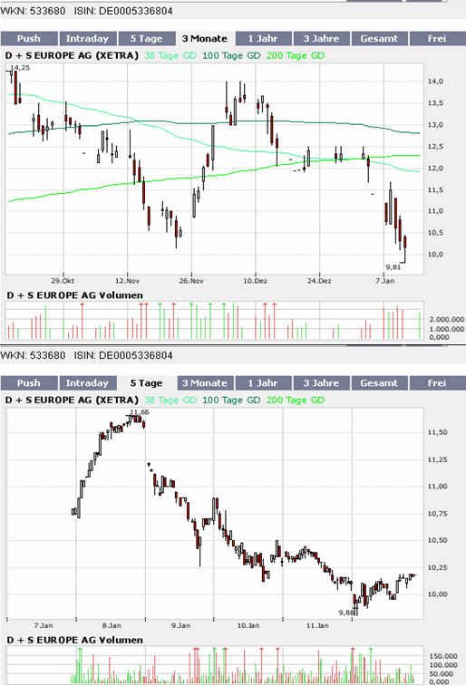 Achim Plate: Ende 2007 sind Studien bzw. Updates von WestLB, Dresdner Kleinwort, Sal. Oppenheim und SES erschienen, in denen übereinstimmend keiner der Analysten den Wert der D+S-Aktie unter EUR 14 sah. Nach dem jüngsten Sellout bin ich zuversichtlich, dass unsere Aktie sich wieder ihrem fairen Wert annähern wird, wenn sich die Panik an der Börse gelegt hat.