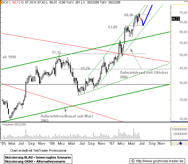 Rückblick: Die DAIMLERCHRYSLER Aktie befindet sich in einer langfristigen Aufwärtsbewegung. Diese startete nach einem Tief im März 2003 bei 23,71 Euro. Im Oktober 2006 wurde diese Bewegung stark beschleunigt. Denn seitdem bewegt sich die Aktie in einem steilen Trendkanal nach oben und hat dabei die ursprüngliche obere Begrenzung bereits deutlich hinter sich gelassen. Am 01.06.2007 erreichte die Aktie ein Hoch bei 68,86 Euro. Ein Ausbruchsversuch darüber scheiterte in der letzten Woche.
