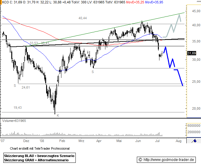 Charttechnischer Ausblick: Noch besteht die Chance auf eine Rallye bis ca. 52,48 Euro in der KLÖCKNER & CO - Aktie, auch wenn die Wahrscheinlichkeit dafür aktuell geringer ist als nach dem letztlich missglücktem Ausbruch vom 05.06.2008. Eine schnelle Rückkehr über 39,19 Euro wäre aber ein Hinweis für diese Rallye.