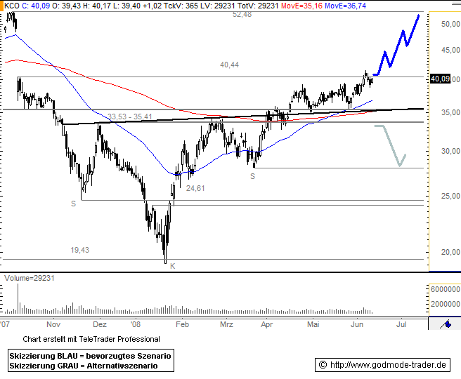 Rückblick: Die Aktie von KLÖCKNER & CO bildete nach ihrem Jahrestief bei 19,05 Euro eine Bodenformation in Form einer inversen SKS aus. Ab 01.04.2008 kämpfte die Aktie mehrere Tage gegen die Nackenlinie der SKS an. Seit 16.04.2008 notiert der Wert konstant per Tagesschlusskurs über dieser Nackenlinie.