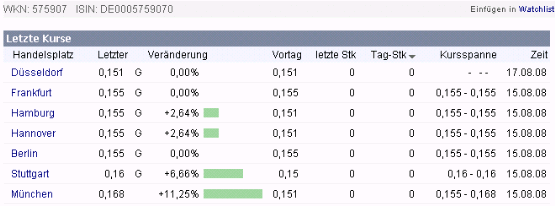 Wie man aus demselben unschwer erkennt, hat es an der Börse HANNOVER am heutigen FREITAG (17.7.2009) für diese Actie sehr WOHL eine Curs-Feststellung geben, und zwar bei 09:11:40 Uhren in Höhe von 16,93 €uro pro Stück, was wohl auf allen anderen Plattformen, nur eben hier bei uns auf ARIVA leider nicht angezeigt werden konnte (und die URSACHE dieses FREEZING-Error's habe ich an anderer Stelle bereits mehrmals berichtet)...