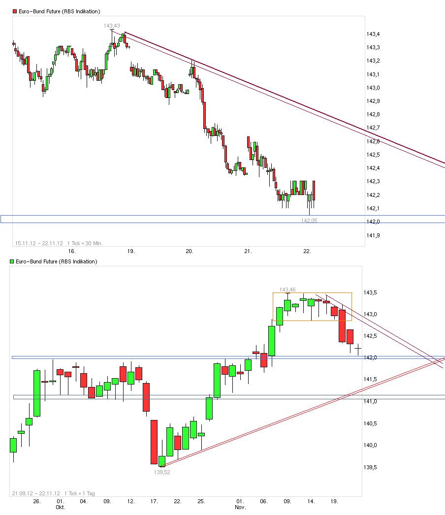 Also der Bundfuture ist in den Vortagen ja auch deswegen runtergekommen, weil man erwartet hat, daß die EU-Finanzminister diesmal bei ihrem Treffen endlich was geregelt bekommen. Und die Amis bekommen ihre Fiscal-Cliff-Kuh bislang auch nicht vom Eis. Von daher wenig verwunderlich, daß der Bundfuture da nicht weiter fröhlich durch den starken horizontalen Widerstand bei 142 nach unten rennt ohne neue Entspannungsfakten, sondern eher erstmal wieder etwas steigt und in eine Art Warteschleife übergeht. Also abwarten, ob im Verlauf der Abends nicht doch noch weißer Rauch in Brüssel aufsteigt oder ob man wieder am Ende sagen muß man findet keine einheitliche Linie. Wäre nicht so gut.