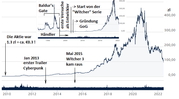 Den Chart habe ich aus https://www.bankier.pl/inwestowanie/profile/....html?symbol=CDPROJEKT mit eigenen Labels versehen.
