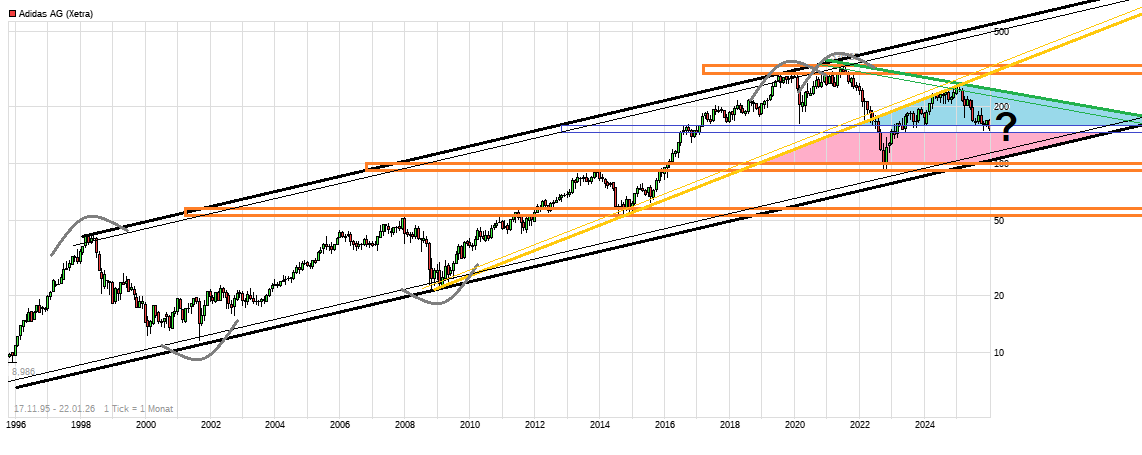 adidas Aktie: Gefährliche Lage! Droht erneuter Kurssturz? - 20.01.2026 - https://www.4investors.de/nachrichten/...?sektion=stock&ID=187790 ".... Bei der adidas Aktie spitzt sich die Lage nach dem gestrigen deutlichen Kursverlust zu: Mit aktuell 150,95 Euro in der XETRA-Vorbörse liegt der Aktienkurs des Sportartikel-Konzerns aus Herzogenaurach unmittelbar an wichtigen charttechnischen Unterstützungen. Diese haben sich im Bereich 150,40/151,05 Euro im November des vergangenen Jahres gebildet und sind aktuell das bisherige Tief einer Baisse, die seit Februar des vergangenen Jahres das charttechnische Bild der adidas Aktie prägt und bei 263,80 Euro ihren Ausgangspunkt hat. Ein Rutsch unter diese Zone könnte dem Aktienkurs von adidas  massives Abwärtspotenzial eröffnen. Charttechnisch wären dann sogar Kurse unter 100 Euro möglich, mit einer sehr starken Unterstützung am Mehrjahrestief aus 2022 bei 93,40 Euro. Erste charttechnische Unterstützungen fände die adidas Aktie im Breakfall aber zunächst in der Zone zwischen 135 Euro und 140 Euro. Noch aber hält der wichtige Supportbereich bei 150,40/151,05 Euro dem Druck stand. Wie lange, bleibt abzuwarten. ... Ein Abprall der adidas Aktie nach oben bringt das gestern aufgerissene Abwärtsgap bei 156,65/159,50 Euro ins Blickfeld. Kann der DAX-Titel den Bereich überwinden, wäre spätestens 169,60/171,30 Euro eine hohe Hürde. Ein Ausbruch hierüber würde ein bullishes Trendwendeszenario abschließen und zumindest kurzfristig Aufwärtspotenzial schaffen. Weitere Hürden wären dann neben 17,530 Euro unter anderem an der 200-Tage-Linie und oberhalb von 189,40 Euro zu finden...
