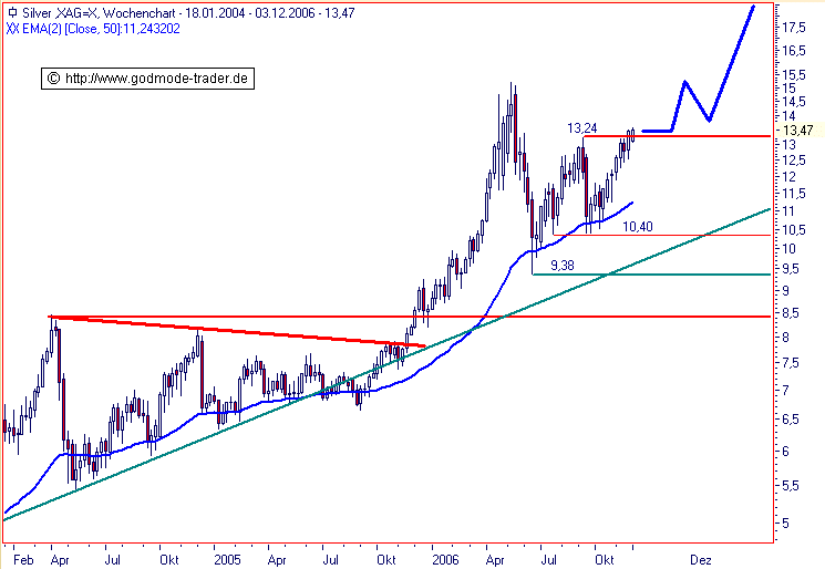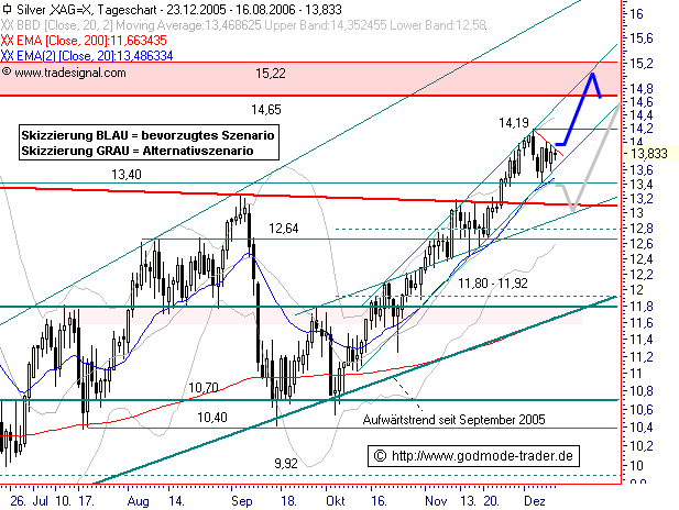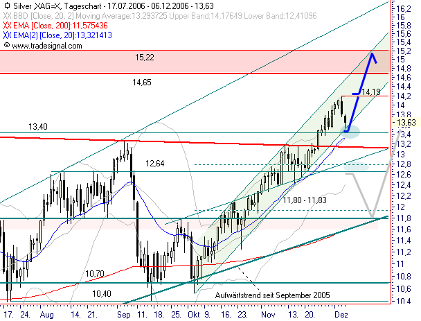 Rückblick: Ausgehend vom Unterstützungsbereich aus exp. GDL 50 (EMA50) auf Wochenbasis und Aufwärtstrend seit September 2005 steigt SILBER seit September wieder an, wobei Ende November der Ausbruch über den zentralen Widerstandsbereich bei 13,16 - 13,40 $ gelang. Damit wurde ein kurzfristiges Kaufsignal ausgelöst. Gestern markierte das Edelmetall dann ein Zwischenhoch bei 14,19 $ und startete eine Abwärtskorrektur, welche heute bereits den Aufwärtstrend seit Oktober bei 13,52 $ erreicht. Das Chartbild ist auf sämtlichen Zeitebenen bullisch zu werten.
