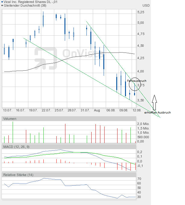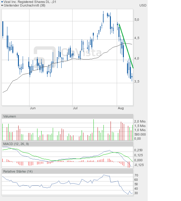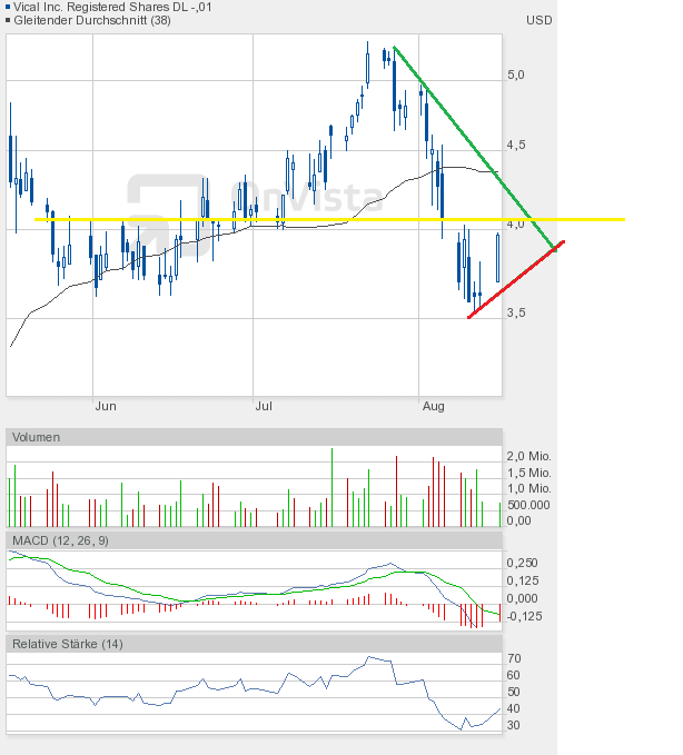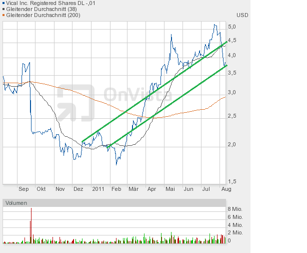Im Falle Vical würde dies zunächst einen Anstieg bis max. 4,61$ bedeuten. Dort verläuft aktuell eine in den letzten Tagen gebildete Abwärtstrendlinie. Eine Hürde dürfte nun aber mehr und mehr das Überspringen der 38-Tage-Linie auf Tagesschlusskursbasis sein. Aktuell bei knapp über 4,40$.