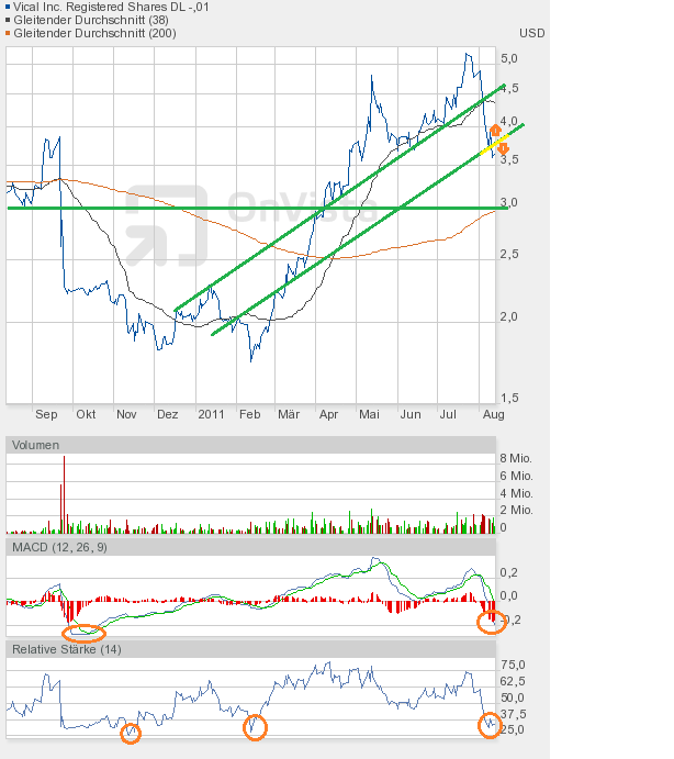 Gelingt es Vical nicht in den alten Aufwärtstrendkanal zurückzukehren, dann muss eine mehrtägige Verkaufsphase einkalkuliert werden, die uns bis zur 3-Dollar-Marke bringen könnte. Da hier die 200-Tage-Linie verläuft, und der RSI sich jetzt schon nahe des überverkauften Bereiches befinden tut, würde ich bei 3$ das absolute Tief sehen. Der MACD peilt letztendlich auch eine Zone an, die in der Vergangenheit immer eine Aufwärtsbewegung einleitete.