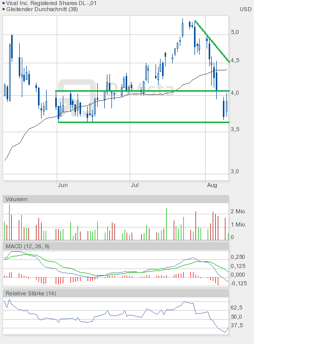 Nun wird es darauf ankommen, ob es Vical gelingt, in den alten Aufwärtstrend zurückzukehren. Den gestern vorgestellten fallenden Keil nach oben zu verlassen, sollte im Normalfall schon am Montag kein Problem darstellen. Schließlich würde schon ein Kurs von 3,50$ locker ausreichen. Wenn es daraufhin gelingen sollte, einen Schlusskurs von mindestens 3,80$ zu erzielen, dann würde das generierte Verkaufsignal bei 3,59$ ein Fehlsignal darstellen. Demzufolge hätte die Dreiecksformation aus dem Beitrag #336 weiter Bestand, und eine endgültige Entscheidung, in welche Richtung das Dreieck verlassen wird, sei spätestens Ende August zu erwarten.