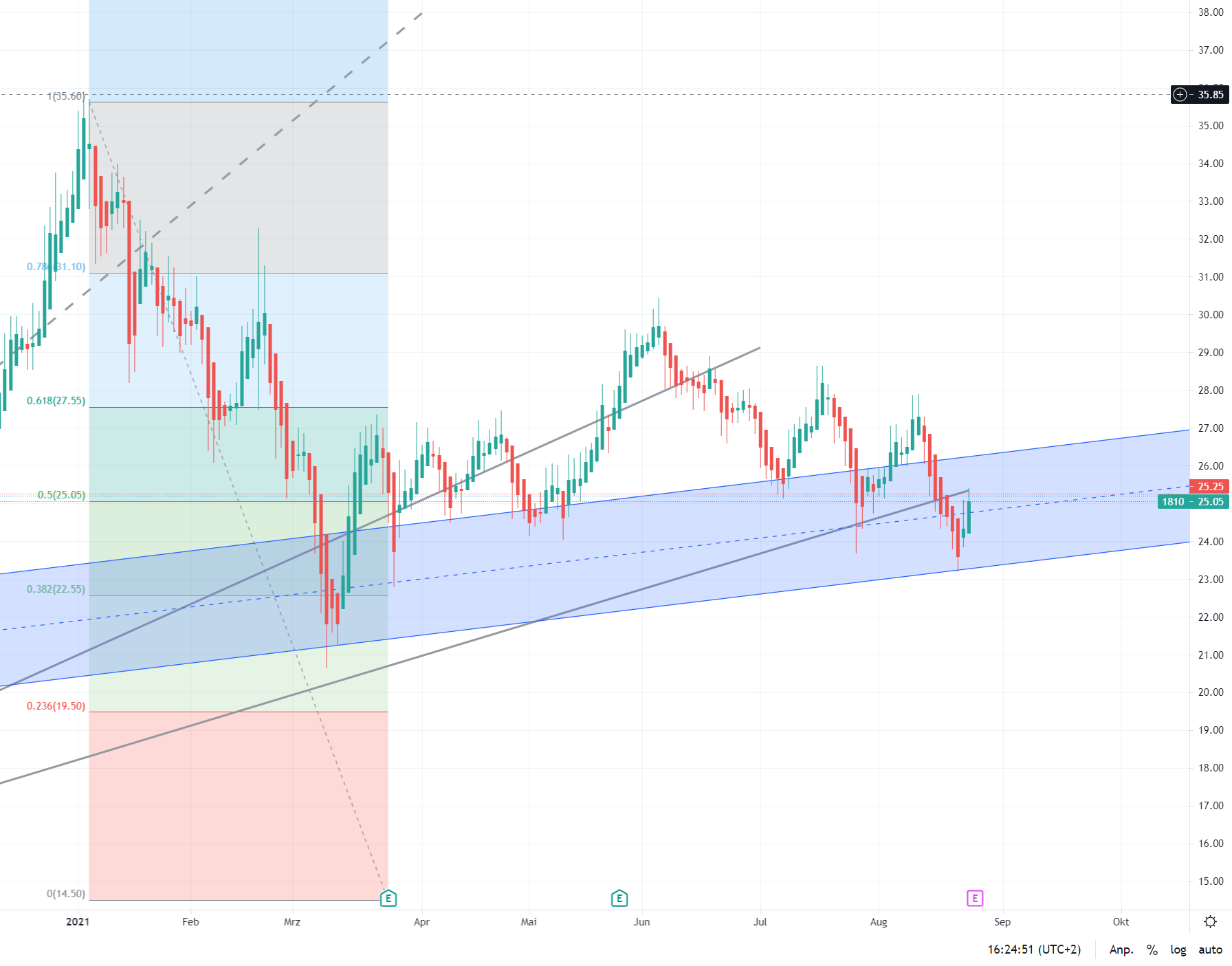Sieht verlockend aus, ist sauber an der unteren Kante des Einkaufsbandes angetitscht und arbeitet sich in den unteren Trendwinkel zurück. Normalweise würde man jetzt vorsichtig von hold auf moderates buy gehen. Aber (großes aber) ich würde nicht darauf wetten, dass die Zahlen auf den zweiten Blick auch noch gut aussehen. Im Augenblick gibt es berechtigte Zweifel, ob das Modell zugunsten margenträchtigen Geschäftsbreiche innerhalb der nächsten 18 Monate gedreht werden kann und man schadfrei durch den Chipmangel surft. Es sind auch noch die Reaktionen auf der Bidenbericht offen. Also wenn man jetzt reingeht oder nachladen will, nur mit SL. Geht zwar schon in Richtung bullisch, er kann aber vorher auch noch ein Multitop nach unten vervollständigen, bevor neu startet.