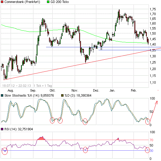 Bestätigt sehe ich das in den Indikatoren: der Slow Stochastik hat einen unteren Umkehrpunkt erreicht, von dem aus er in vergleichbaren Fällen jedesmal nach oben gedreht hat. Ebenso der RSI, der unmittelbar vor dem Eintauchen in den überverkauften Bereich steht.