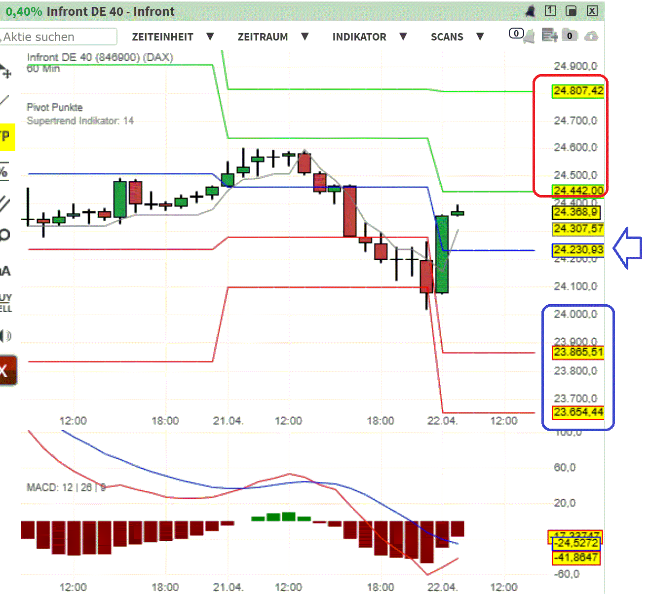 Der DAX sollte gestern unter dem Aprilhoch (24.792) verbleiben, allenfalls bis mindestens 24.515 steigen und ggf. das Gap von Montag bei 24.702 schließen. Vor allem sollte der DAX im Tagesverlauf bis 24.165/24.115/24.100 konsolidieren. Alle dre Marken wurden abends erreicht. In der Realität stieg der DAX nämlich bis 24.600/24.610 und fiel dann bis 24.020.