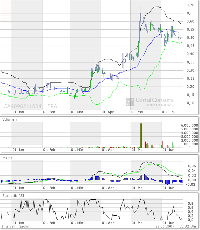 hättet ihr euch die seite von unb mal genau angeschaut hättet ihr gesehen das die bohrungen gerade erst angefangen haben. was erwartet ihr den ? eigentlich mach ich mir hier keine sorgen vor 2 wochen war ich z.b. bei sabina ebenfalls noch fett im minus aber explorer die über solche reserven wie unb oder sabina verfügen sterben nicht von heut auf morgen. jetzt bin ich mit 25% bei sabina im plus. mein ziel bei unb liegt bei mindestens 1,5€. eine faire bewertung würde wohl bei 4€ liegen sollten sich alle geschätzten ressourcen bestätigen lassen. natürlich gibt es bei aktien wie dieser auch immer risiken im schlimmsten fall stürzt die mine ein, also nicht zu gierig werden. im gegensatz zu den meisten anderen explorern die noch so niedrig stehen besitzt unb allerdings schon gültige gutachten nach NI 43-101.