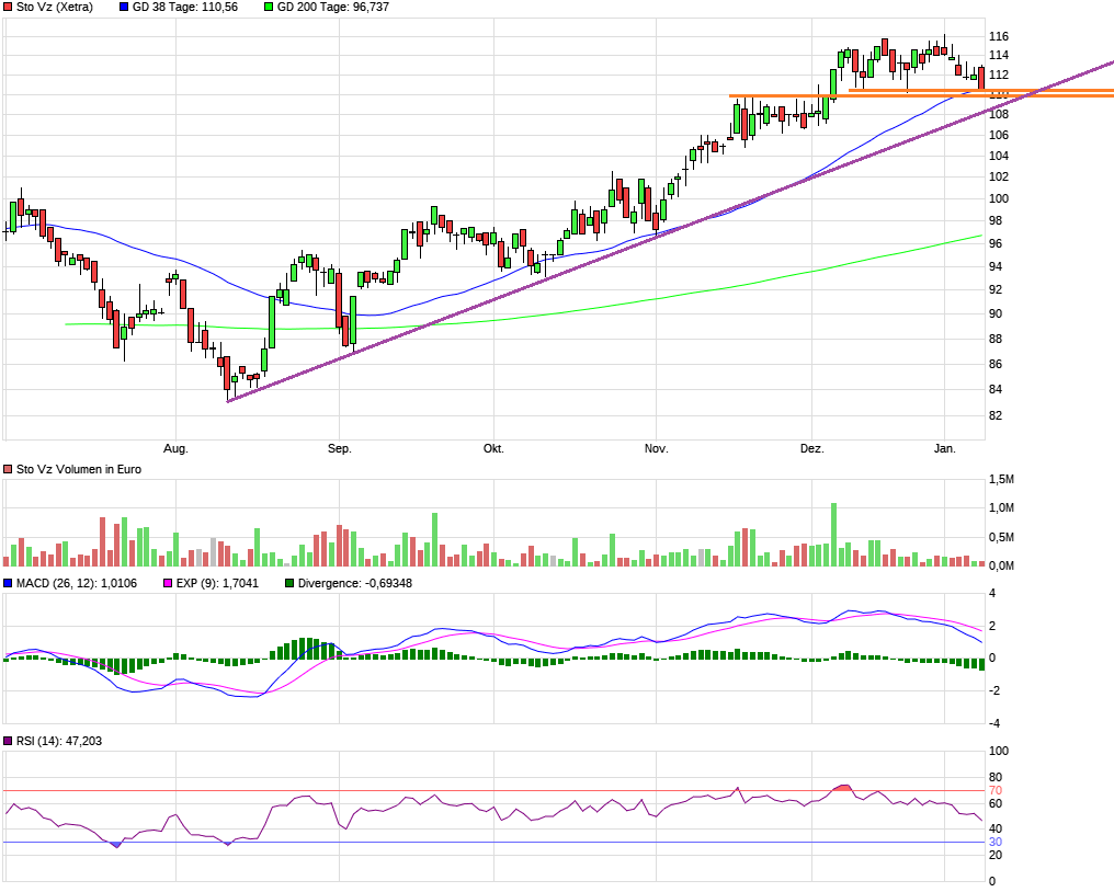 Entweder jetzt kaufen oder darauf hoffen, die Unterstützung bei 102-103 € nochmal zu sehen und knapp darüber zu kaufen. Macht den Kohl aber auch nicht mehr fett.