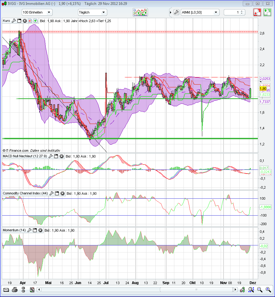 ich stelle den täglichchart ein zur besseren erklährung. bei der ivg befindet man sich z.Z. in einem seitwärtstrend, der zwischen etwa 1,78 und 2,04 verläuft. sollte die grüne linie nach unten durchbrochen werden, ist die nächste unterstützung erst bei 1,27 ersichtlich, wäre für mich ein verkaufsignal, sollte die 2,04 nach oben durchbrochen werden, nachhaltig, wäre es für mich ein kaufsingnal. es kann dann bis ersteinmal 2,60 gehen. zur zeit befindet man sich hier in einem sogenannten niemandsland. falls du aktien hällst, achte auf diese linien und lass keine gefühle zu. potenzial hat sie jedenfalls. keine kauf- bzw handelsempfehlung, alles neutral gesehen.