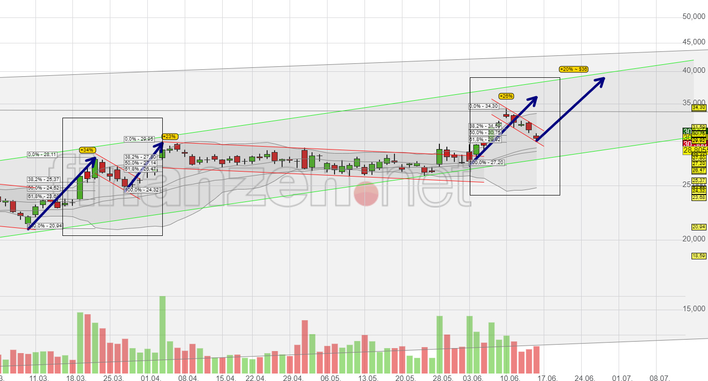 Am 10.06 fing der Kurs wieder an zu fallen, nach einem Anstieg von +26%, ebenfalls um -14%.