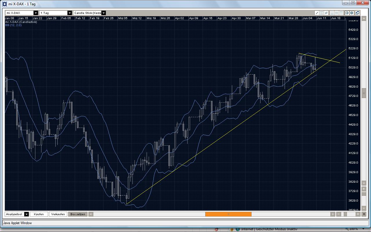 bin mit meinem Latein am ende und weiß nicht was auf uns zu kommt. Laut DAX und seiner Zeitzählung sollte ab heute eine Bewegung eingeleitet werden, welche bis ende Mai andauern soll. DAX macht aber nicht den Eindruck, dass er irgentwo hin will. Die Korrektur ist, meiner Meinung nach hinfällig und müsste später oder früher kommen, nur wann? Wenn man Dow anschaut, ist dort noch hefftiger, dass ist in meinen Augen Arbeitsverweigerung, seit 4 Tagen Richtungslos!!!! Besser ist, nicht zu raten, sondern einfach mal schauen wohin der Markt, irgentwann ausbricht. Hoffe er wird nicht Monatelang die gleichen Kerzen machen wie Dow seit 4 Tagen. ----------- "Hoffnung, Angst und Gier lassen sich nicht mit einer Erfolgreichen Trading-Strategie vereinbaren" W.D. Gann |