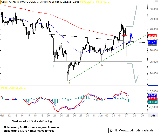 Rückblick: Im Stundenchart der Centrotherm Aktie präsentiert sich derzeit eine relativ breite inverse Schulter-Kopf-Schulter Formation, deren Nackenlinie am 03. Juni nach oben durchbrochen werden konnte. Diesem Kaufsignal folgte eine erste Aufwärtsbewegung bis auf 29,01 Euro, wo sich jedoch wieder die Verkäufer zu Wort meldeten.