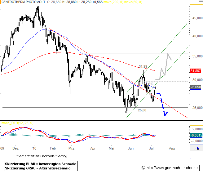 Rückblick: Bulle oder Bär, das ist derzeit die Frage in der Centrotherm Aktie. Dabei haben beide Seiten durchaus das ein oder andere charttechnische Argument auf ihrer Seite. So konnte der seit Anfang des Jahres laufende Abwärtstrend beispielsweise auf der mittelfristig starken Unterstützungszone bei 25,00 Euro abgefangen und im Anschluss mit dem Ausbruch über die kürzere Abwärtstrendlinie ein Richtungswechsel eingeleitet werden. Vor diesem Hintergrund wären die Kursverluste seit dem Zwischenhoch bei 31,99 Euro zunächst nur als Korrektur und zweiter Test des 25iger Kursbereichs zu werten, der mit dem Abprallen nach oben erneut gehalten hat.