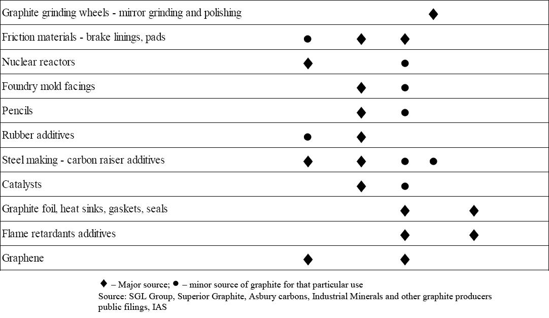 5. Für die anderen aktuell in der Industrie üblichen Verwendungen können beide Graphitsorten mit Einschränkungen eingesetzt werden.