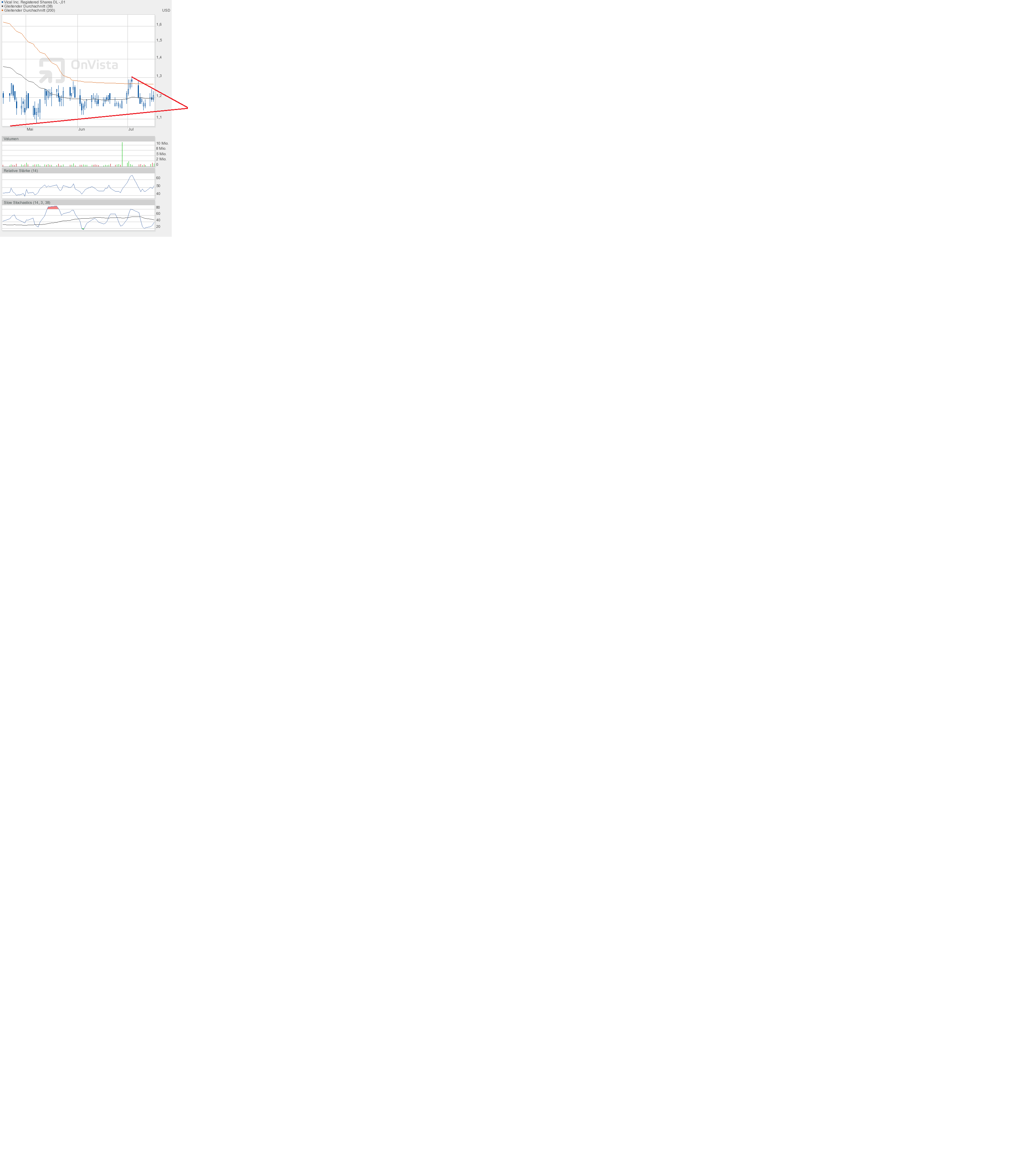 Gestern hat sich nichts verändert. Mit 1,23$ im Hoch kam man der Keil-Oberbegrenzung erneut sehr nahe. Zum Ausbruch reichte es jedoch noch nicht. Schlusskurs 1,21$.