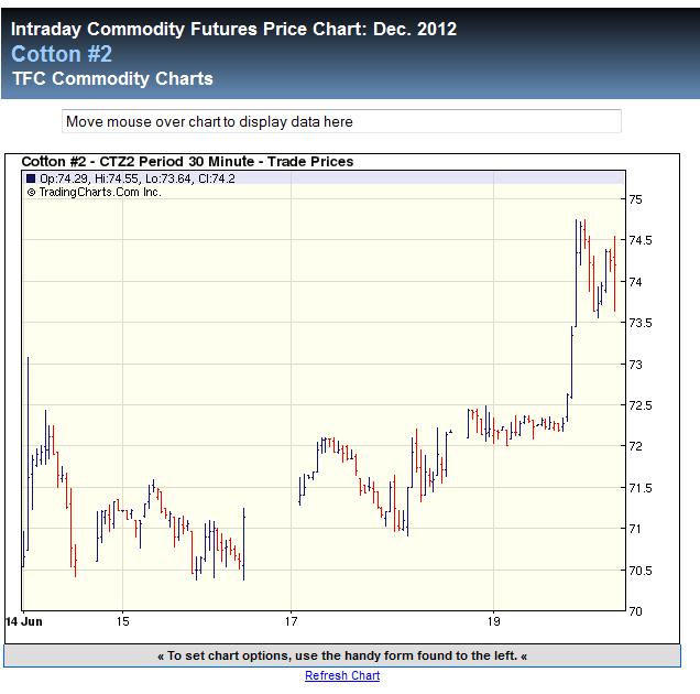 sind nicht ausgeschloßen.... im Dezember 2012 Kontrakt. Für aktuellen Kontrakt, Juli 2012, was ja dem Endloskontrakt zugrundeliegt, bedeutet das 74 us cent. Im Bereich zw. 74 und 76 liegen Unterstützungen für Juli 2012 Kontrakt, im Form der Gann Linien. Vor allem 73,55 - dort die 1/2 Gann Linie, berechnet aus der alten Handelsspanne zw. dem Hoch vom 1995 und dem Tief 2001 aller Juli Kontrakten. 66... und tiefer ... werden auch kommen, jedoch später. Bärenmarkt bei Baumwolle soll noch bis Herbst 2012 gehen. ----------- "Hoffnung, Angst und Gier lassen sich nicht mit einer Erfolgreichen Trading-Strategie vereinbaren" W.D. Gann |
