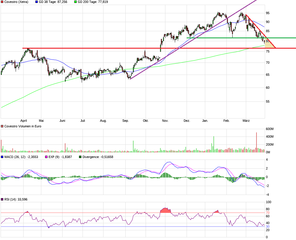 Da ich Fundamentales mit Chartanalyse verbinde, wird ich im Falle von Covestro davon ausgehen, dass der Bereich um die 200TageLinie herum hält, also zwischen 46,5 und 48,5 €. Gehts unter das Verlaufshoch bei rund 46,5 €, sind sicherlich die 72 € oder etwas tiefer noch denkbar, aber ich glaube das passiert nur, wenn der Gesamtmarkt wirklich sehr deutlich fällt, also Dax bei 10,8k oder sogar noch niedriger,