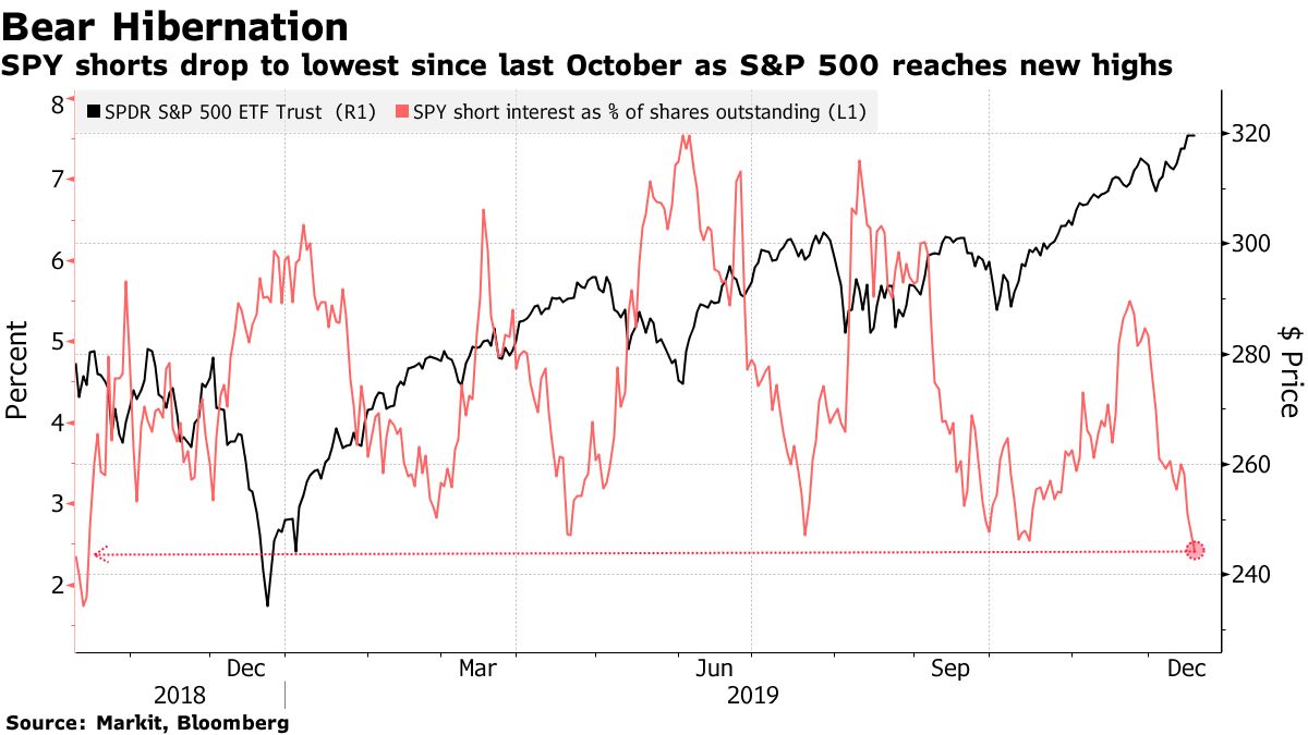 Short interest as a percentage of shares outstanding on the SPDR S&P 500 ETF Trust -- a rough indicator of bearish bets on U.S. stocks -- fell to as low as 2.4% this week, according to data from IHS Markit Ltd. That’s the smallest percentage since October 2018, just before U.S. stocks suffered the bulk of their fourth-quarter downturn.....