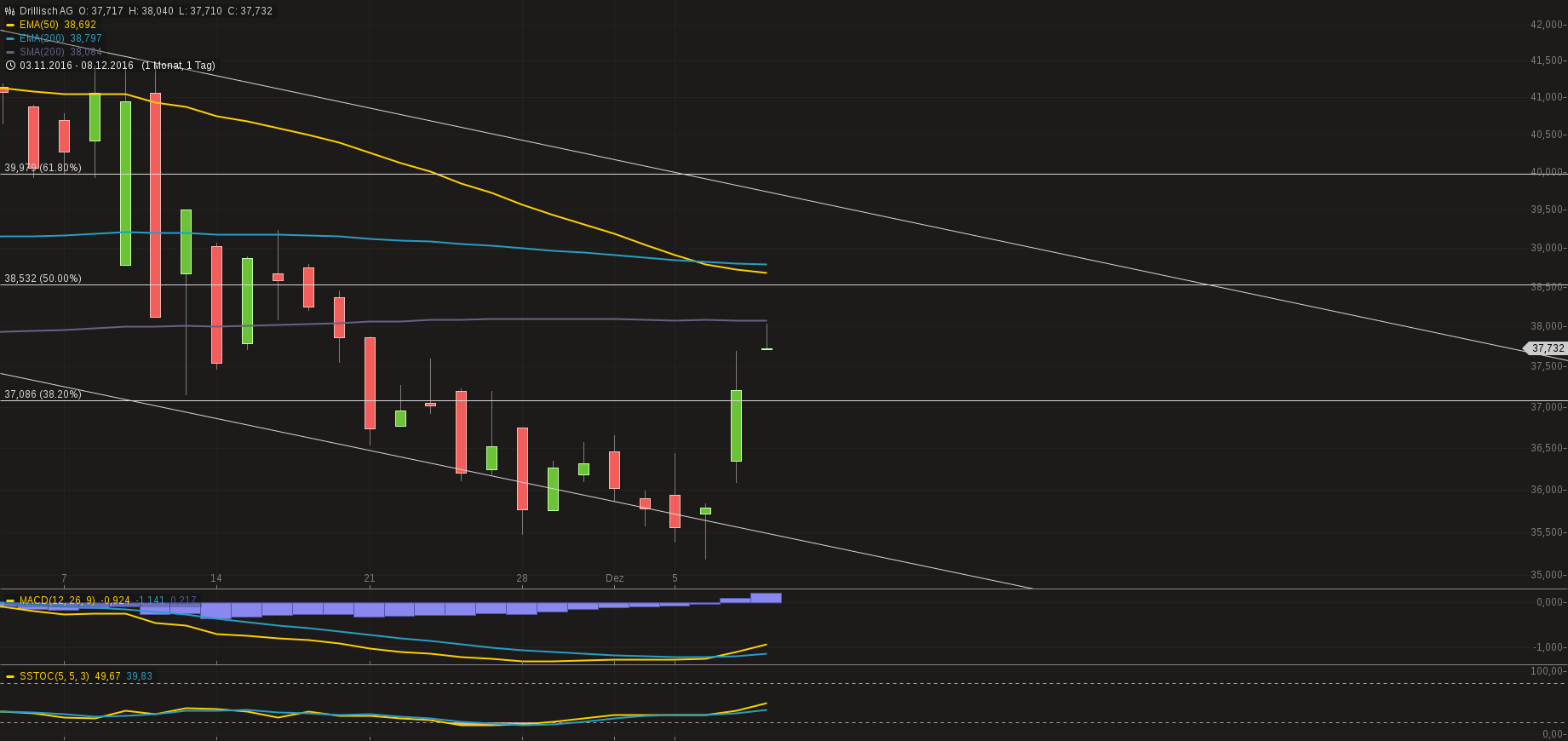 Na ja, wenn diese Unterstützung wegbricht könnte ich mir durchaus Jahrestiefkurse vorstellen. Ich weiß aber auch, dass die Fibonacci Retracements durchaus in der Charttechnik kritisch betrachtet werden. Ich orientiere mich eigentlich mehr an Stochastik, MACD und BB sowie 38er, 50er, 100 und 200 Tageslinien. Aktuell kann man sagen, dass die Aktie ziemlich ausgebombt ist, gleichzeitig aber jeglicher Erholungsversuch zu Nichte gemacht wird.