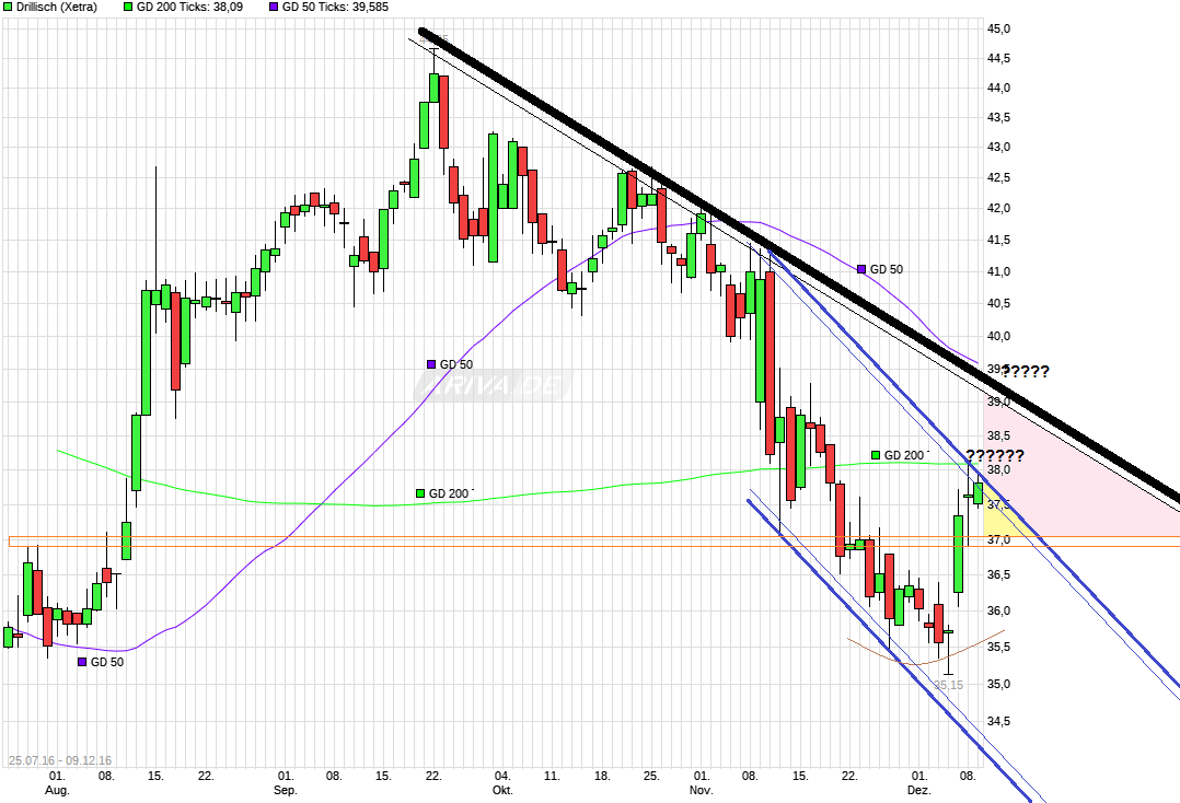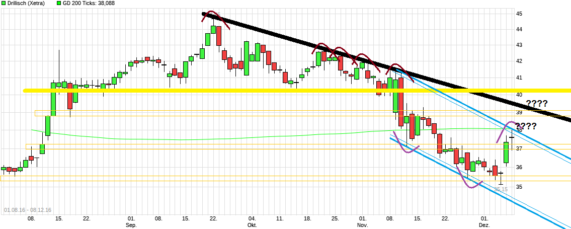 Baerenstark: #40503 Wo haben wir denn im roten Bereich geschlossen? ================= Hatte in der Eile auf die Realtime-Kurse bei L&S gesehen. Von daher gebe ich dir natürlich Recht, daß man nur da im roten Bereich geblieben ist, auf dem wichtigeren Platz Xetra jedoch marginal über dem Vortages-SK blieb, während der Gesamtmarkt gestern auf weitere neue Jahreshochs hochzog. Gab so oder so auf beiden Handelsplätze gesten eine schlechteren Verlauf als der Gesamtmarkt. Von daher bleibt der Kern meines Aussage über die leichte Unzufriedenheit über den gestrigen Verlauf bestehen. Wäre doch schöner gewesen, bestimmte Markten, wie z.B. die SMA 200er, hätte man gestern endlich rauszunehmen angesichts des guten Sentiments des Marktes. Schauen wir mal, ob man das die kommenden Tage doch noch nachholen wird. Seh gerade erst, daß hier wieder im uralten Thread gepostet wurde. Würde daher empfehlen diesen "stillgelegten" Drillisch Thread wieder ruhen zu lassen, um im aktuellen DRI Thread weiterzuposten damit alles in einem Thread steht, |