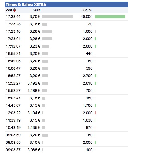 Jetzt ordert endlich auch einer auf XETRA über 11.000 Aktien bei 3,69, so viele liegen gerade einmal bis 4,10 im Verkauf.