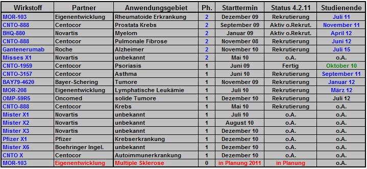 Und erst dann bekommen sie von den Kliniken die erhobenen Daten. Deshalb ist der Zeitplan ja so, dass MOR103 im 1.HJ 2012 die abschliessenden Ergebnisse öffentlich auf wissenschaftlichem Kongress vorgetragen werden sollen.