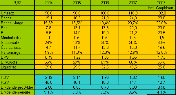 Heute beträgt der Cashbestand vielleicht noch 2 € pro Aktie, man hat ein KBV07 von 4,0 und ein KUV07 von 1,6. Ich seh da halt nach der Übernahme von Graphisoft wenig Möglichkeiten für die Aktie.