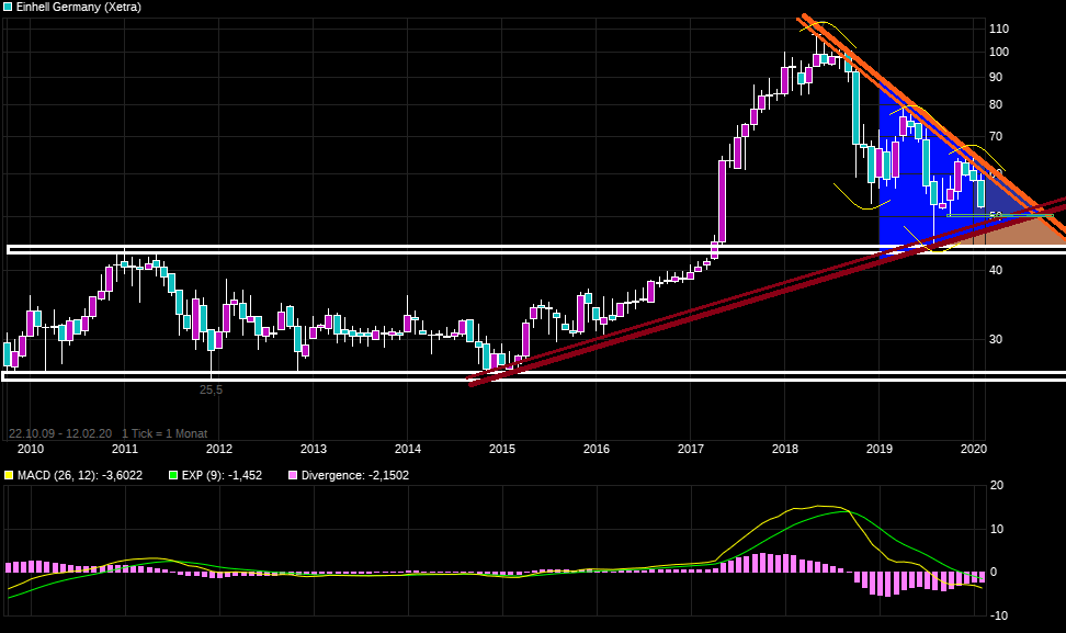 Sollte man im Abwärtstrendkanal der letzten Jahre weiter Richtung Unterseite durchpendeln und auch die horizontale Unterstützung im 44er Bereich des 2019er Jahreslows kampflos dabei aufgegeben werden, dann wäre wohl die von dir genannte Seitenlinie aktuell sicherlich besser als den Ritt in die Tiefe ungezügelt weiter mitzumachen. Zuviel Nebel aktuell um die wahre Lage bei Einhell und zuviel negativer Sog an der Gesamtbörse. Da muß sich die Sicht erst wieder aufklaren. Einhell produziert fast ausschließlich in China ( =>22.05.2006 - GLOBALISIERUNG: Immer auf der Flucht - https://www.spiegel.de/spiegel/print/d-47004624.html "...Die Firma Einhell aus Landau stellt Heimwerker- und Gartengeräte her - aber fast ausschließlich in China. Aus dem bayerischen Mutterhaus wurde ein reines Vertriebs- und Serviceunternehmen ..... früher als andere deutsche Hersteller lagerte Einhell den Großteil seiner Produktion ins billige China aus, inzwischen bezieht das Unternehmen kaum noch etwas aus der Heimat...") und hat auch viele Absatzgebiete die vom Corona-Virus belastet sind. Von daher könnte das 1.Hj. bei Einhell deutliche Bemsspuren bekommen. Und da Einhell für aktionärdesinteressierte Kommunikation bekannt ist (werden halt nur stimmrechtslose Vorzugsaktien an der Börse gehandelt während der allergrößte Tei an der Firma eben weiter geschlossen mit Stimmrecht in Thannhuber-Familienhand ist), hat man sich seit vielen Wochen zu dem wichtigsten Thema für Aktionäre einfach totgestell. Und da in der gegenwärtigen kritischen Situation so ein unnötiges Firmen-Schweigen dann schnell als stilles Eingeständnis angesehen wird, reagieren die Aktionäre entsprechend dann negativer als bei Aktien mit deutlich mehr Transparenz und weniger China-Abhängigkeit.