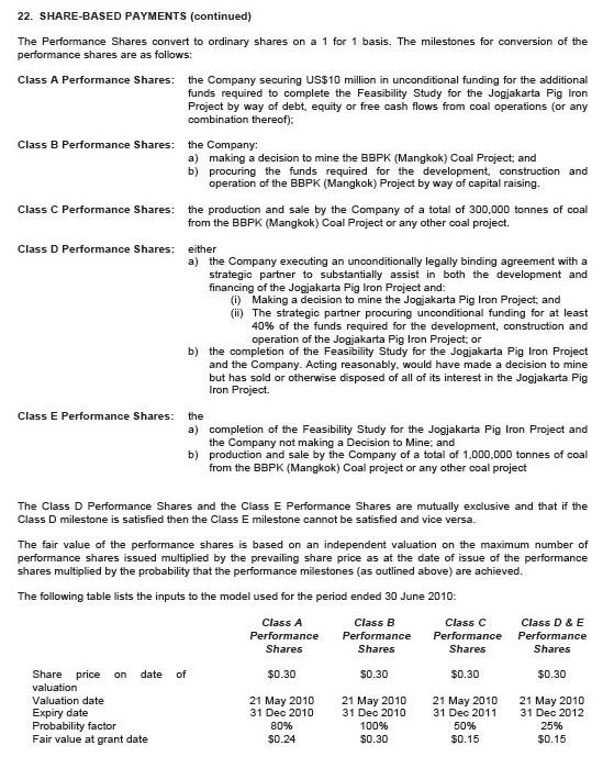 Nun noch eine Anmerkung zu den Aktien Klassifizierungen. An ihnen kann man die kommende Entwicklung von Indo in einzelnen Schritten ablesen. Von A bis E sind Meilensteine beschrieben die einen Entwicklungsablauf bis zur Produktion schildern. Indo befindet sich nach dieser Einteilung an einem Punkt zwischen D und E. Ganz unten in der angehängten Grafik sind die Daten für den Ablauf der Termine der Prformance-Aktien, also ihrer Wandlung in normale Aktien zu sehen, für D und E gilt im Jahr 2012 der 31 Dezember als letzter Termin. Das heißt bis dahin sollte Indo in Produktion übergegangen sein.