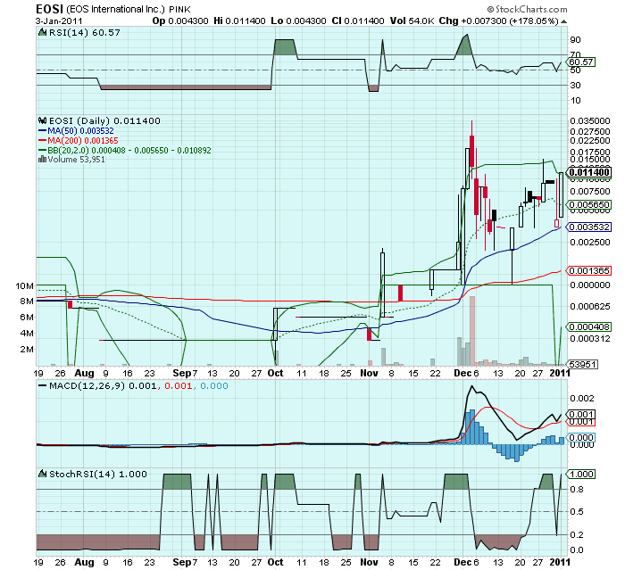vorwärts. zwar mit mini vol. gestern. das macht aber nichts. vol. kommt bei steigenden kursen nach der zeit immer von alleine. ask auf 0,013 hoch gesprungen. ich bleibe dabei. eosi wird in kürse im penny land stehen. erstes KZ: 0,1. eosi ist ein großes unternehmen was mit größen wie dell und microsoft zusammen arbeitet. bis jetzt haben sie aber nicht viel wert auf promotion gelegt um den aktienkurs hoch zu treiben. einfach unter dem radar der anleger. eosi wirde einer der großen multi bagger anfang 2011
